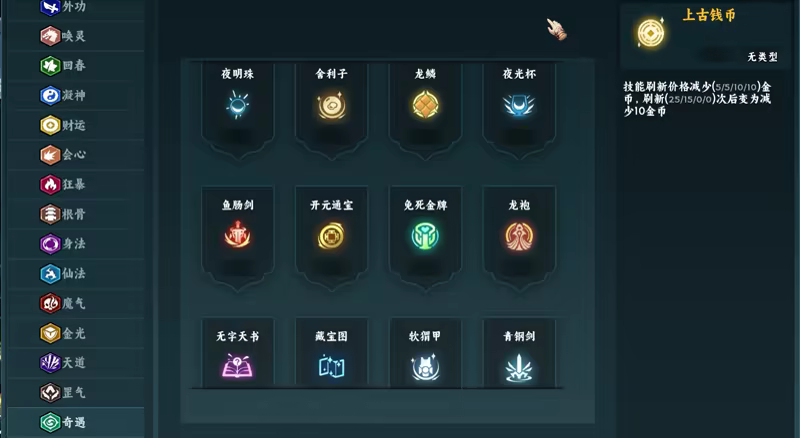 玉如意:指定一个流派为幸运流派,每学习一个该流派技能奖励35金币