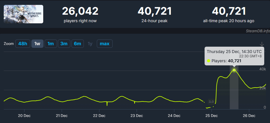 据SteamDB数据,12月25日22点30分,游戏Steam同时在线峰值达40721人,超越此前历次版本纪录,直观体现玩家对新版本的期待。