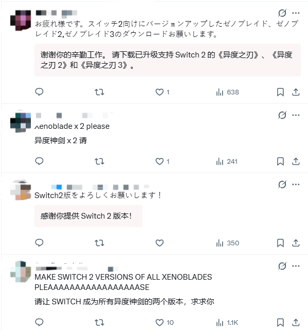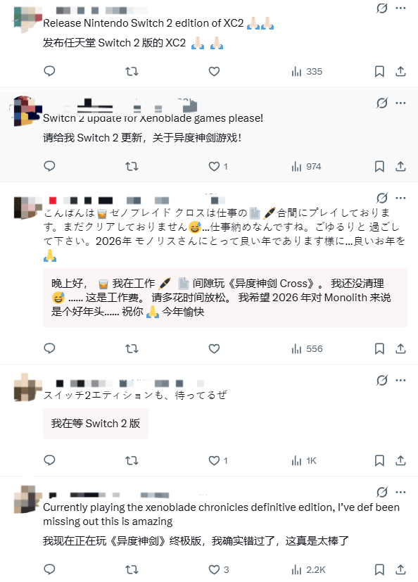 《异度神剑》系列开发商Monolith Soft在官方推特发布年末休假通知,本是常规的年终问候,却意外被粉丝的催更声刷屏——相较于少数的感谢祝福,粉丝们更关注的是“前作升级NS2”的诉求,清一色的催更留言成为评论区主流。