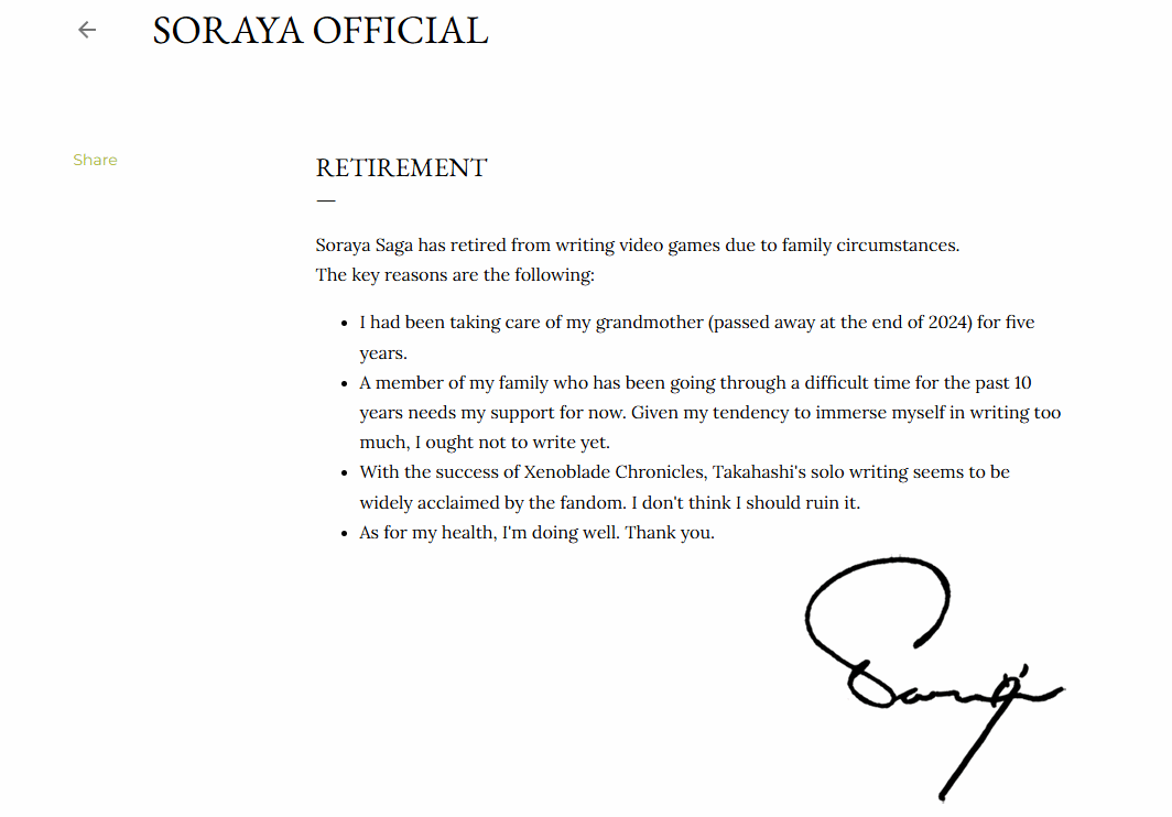 嵯峨空哉在声明中坦陈退休缘由:过去五年照料祖母至2024年底离世,另有一位困境中的家庭成员仍需她支持;且自己易过度投入创作,当前兼顾家庭的情况下,已不适合高强度剧本工作。