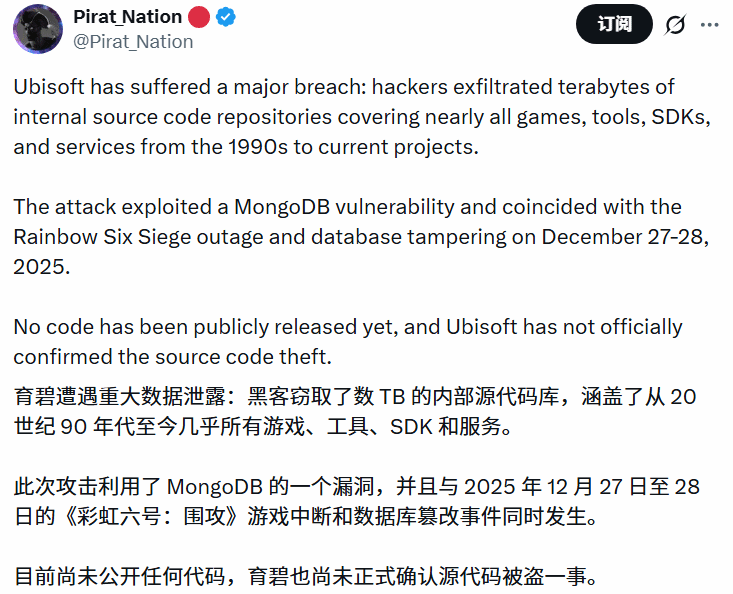 育碧近期的网络安全风波持续升级。此前《彩虹六号:围攻》服务器疑似遭入侵、全服白送21亿点券引发玩家狂欢购物的事件尚未平息,又有重磅爆料传来——推主@Pirat_Nation透露,黑客此次攻击不仅引发了服务器异常,还窃取了育碧近三十年的核心内部数据,规模高达数十TB。