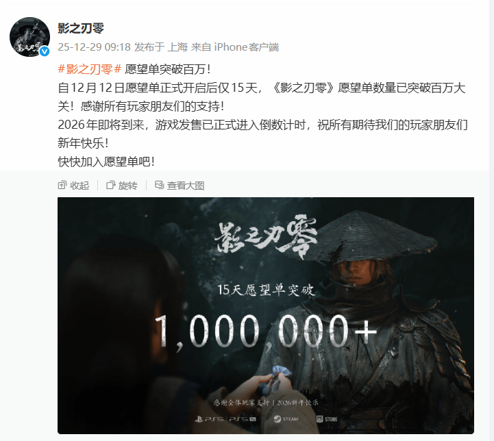 这份亮眼成绩的起点,始于12月12日的TGA 2025颁奖典礼。当晚,《影之刃零》正式公布2026年9月9日全球同步发售的消息,同时确认登陆PlayStation(PS5、PS5 Pro)与PC(Steam、Epic)全主流平台,商店页与愿望单功能同步解锁。从解锁到突破百万愿望单,仅耗时半个月,这样的增长速度远超行业常规预期。
