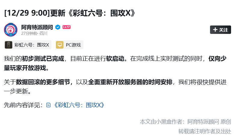 随着处理工作推进,12月29日,育碧官方支持账号“阿育特派顾问”发布了最新进展公告。公告显示,官方已完成初步测试,现阶段正开展服务器软启动工作——在进行线上实时测试的同时,仅向小部分玩家开放游戏体验。