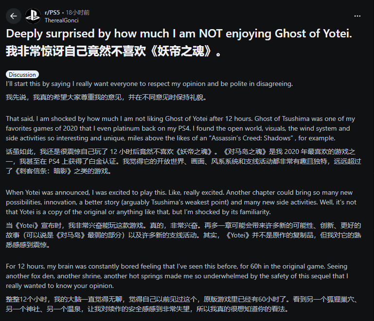 作为《对马岛之魂》的忠实粉丝,@TherealGonci坦言自己对《羊蹄山之魂》的失望超出预期。他在帖文中提到,游戏内的核心内容与前作高度重合,仿佛只是换了场景的重复体验,而单薄的故事线又无法提供足够的推进动力,让他始终难以沉浸。“或许是我的期望太高了,又或者是我太期待那些创新和大胆的东西……羊蹄山本质上太重复了,我觉得有人会喜欢它,但我真的觉得它非常无聊。”这段直白的吐槽,精准戳中了部分玩家的痛点。