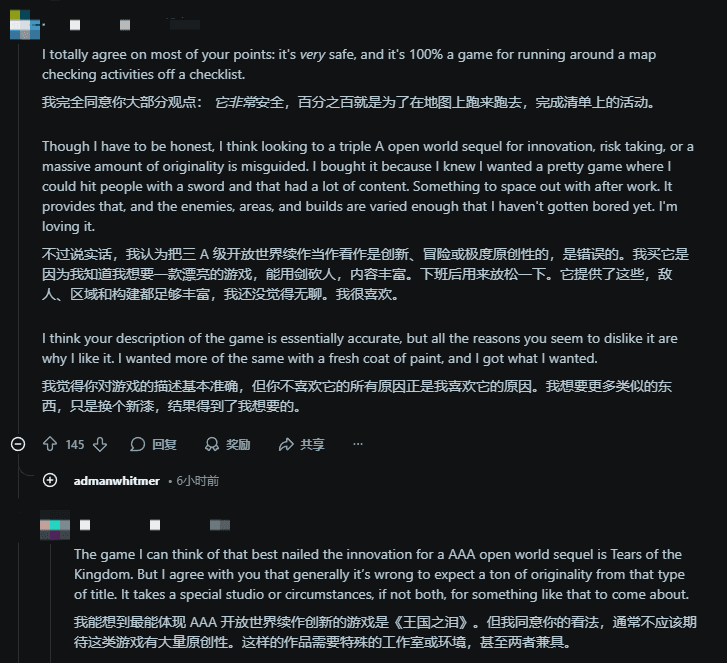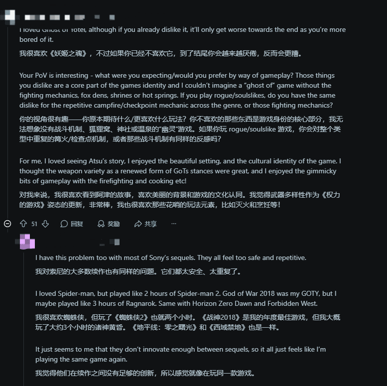 帖文下方,玩家群体迅速分裂成两大阵营。支持@TherealGonci的玩家表示感同身受,他们认为开放世界系列续作若只是简单复刻前作框架,很容易让玩家产生审美疲劳,即便出于情怀尝试游玩,也难以获得新鲜感。更有玩家延伸指出,索尼旗下多款续作都存在类似的“保守病”,过度依赖前作成功模式,同质化问题凸显,导致玩家难以坚持通关。