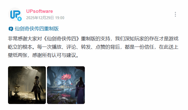 随后,UPsoftware官方账号发文向玩家表达谢意,文中提及:“由衷感谢各位对《仙剑奇侠传四》重制版的支持,我们始终清楚,玩家的认可才是作品立足的根基。每一次播放、评论、转发与点赞,都承载着一份信任。在此特意送上两张壁纸,以此答谢所有玩家的肯定与提出的建议。”