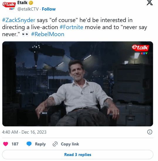 除了深陷游戏乐趣,施奈德还曾公开表达过执导《堡垒之夜》电影的意愿。他坦言:“《堡垒之夜》构建的世界太惊艳了,对我而言也是绝佳的解压工具。这游戏的魅力远超预期,刚入坑时我以为摸清了套路,玩下去才发现远比想象中精彩。”他还坚定表示:“永远别说不可能,这是我在行业里的人生信条。”