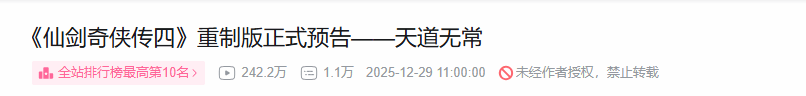 承载十几年青春记忆的《仙剑奇侠传四重制版》正式预告发布即引爆全网。截至12月30日,不足24小时播放量破240万,收获7.7万点赞、6.1万投币,评论超3万条,直观印证了这一经典IP的玩家号召力。