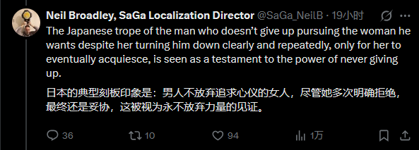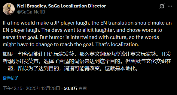 据The Escapist报道,Square Enix旗下《沙加》系列英文本地化总监尼尔·布罗德利(Neil Broadley)近期在社交平台分享日语游戏英译的工作见解,其部分观点引发玩家群体强烈反弹,“反对本地化夹带私货”的声浪持续发酵。