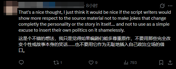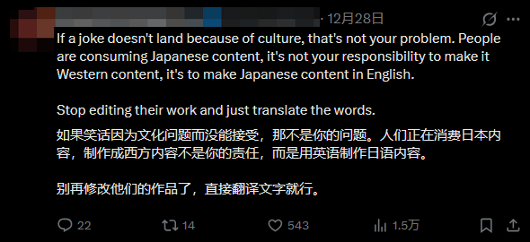 这番言论迅速点燃玩家不满情绪。不少玩家明确反对这一思路,认为这种调整本质是篡改原文、扭曲作品本意。在他们看来,文化差异带来的理解门槛并非本地化人员需要通过修改内容来弥补的问题,尊重原作完整性才是核心原则。更有玩家犀利指出,这种“为了适配而修改”的做法,实则是本地化人员借机将个人立场“夹带私货”植入作品,违背了本地化的初衷。