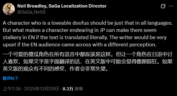 事件发酵次日,尼尔·布罗德利针对争议作出补充说明,称日本文化中被视为讨喜的特质,在西方文化语境下可能引发反感,调整措辞也是为了规避这类跨文化冲突。但这一解释并未平息众怒,多数玩家依旧不买账,甚至有极端声音表示“迫切期待AI取代此类本地化工作”。