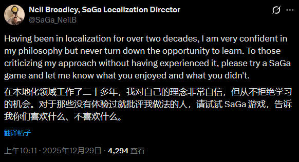 面对愈演愈烈的舆论风波,尼尔·布罗德利再次重申自身创作理念。他强调,自己深耕本地化领域二十余年,对《沙加》系列倾注了大量热爱与心血,建议那些未体验过该系列就贸然批评的网友,先实际游玩后再下判断。同时他也承认,本地化工作始终伴随着争议,而自己的核心目标是让原作的核心理念触达更广泛的受众,这与原作者的创作诉求是一致的。