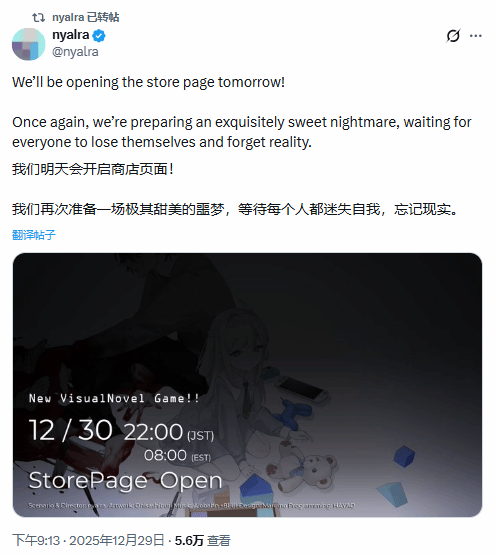 在官宣推文中,@nyalra延续了标志性的个人化表达风格:“明天就要公开商店页面啦!我们再度筹备了一场极致甜美的噩梦,等着大家深陷其中,忘却现实的纷扰。”