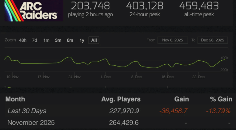 作为近十年评分最高的多人游戏新作,《Arc Raiders》不仅收获玩家广泛喜爱,更创下了亮眼的运营数据:峰值玩家数突破45.9万后,仍保持着86%的高留存率。这一成绩打破了多人游戏发售几周后玩家数量大幅下滑的行业常态,凸显出极高的玩家黏性。