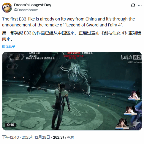 @Dreamboum 在推文中表示:“是时候亲自试试这部作品了。”他还提及,自己长期以来都对《仙剑》系列抱有好奇,计划通过直播体验《仙剑7》。目前,该博主已在Twitch平台开启相关直播。