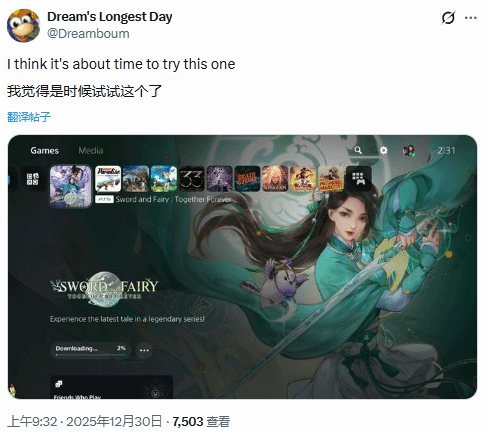 此前率先指出《仙剑4重制版》与《33号远征队》高度相似的海外博主@Dreamboum,其相关推文浏览量已突破262.3万次,成为争议核心源头。就在外界猜测他会持续发声质疑时,这位博主今日却晒出PS5下载截图,画面显示的正是《仙剑》系列最新正传作品《仙剑奇侠传七》。