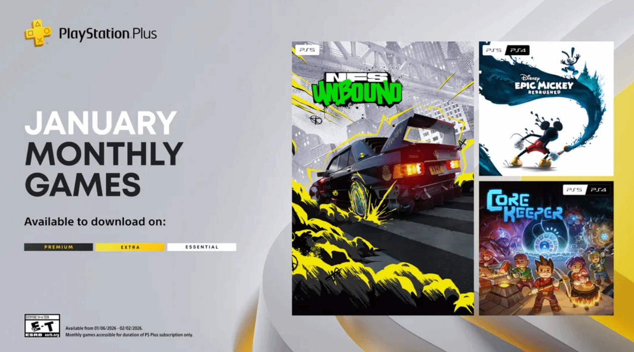 索尼于今日正式揭晓PlayStation Plus 2026年1月月度游戏清单,此次入选的三款作品涵盖不同题材,包括经典赛车系列新作《极品飞车22:不羁》、平台动作冒险类的《传奇米老鼠:重制版》,以及像素风格的采矿沙盒游戏《护核纪元》。