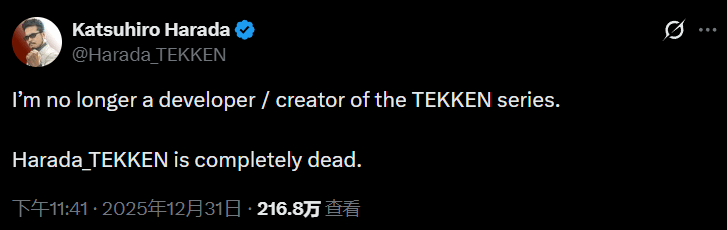 对于全球《铁拳》玩家而言,2026年的跨年伴随着一段传奇的落幕。被视作系列灵魂的“《铁拳》之父”原田胜弘,在跨年之际通过社交平台发布简短声明,正式与陪伴自己三十余年的这一经典格斗IP作别。“我不再担任《铁拳》系列的开发者/制作人了。Harada_TEKKEN彻底落幕。”两句话简洁却分量千钧,为他与《铁拳》的数十年缘分画上了句点。