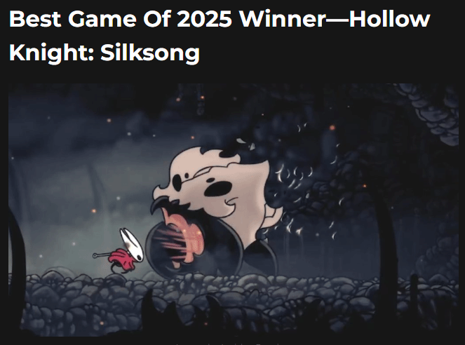 知名媒体Insider Gaming近日公布年度最佳游戏,《空洞骑士:丝之歌》脱颖而出斩获殊荣。这款澳大利亚独立团队Team Cherry的作品,延续前作口碑神话,以现象级表现证明独立游戏在3A主导的市场中亦能登顶。