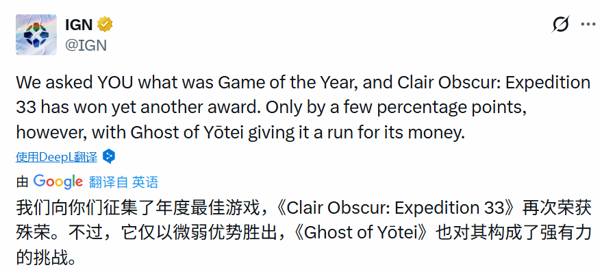 IGN 2025年度最佳游戏结果虽已公布,但最新曝光的评选细节再度引发玩家热议。10天前,《光与影:33号远征队》获评年度最佳,今日IGN官推披露的幕后数据显示,最终决战异常激烈——它仅以51%对49%的微弱优势击败《羊蹄山之魂》,两分差距堪称毫厘之间。