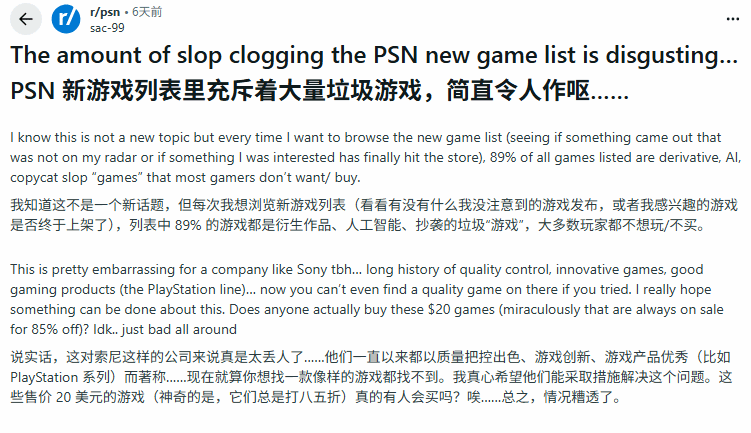 该帖子明确指出,PS商店陈列的游戏中,高达89%都属于衍生续作、生成式AI制作产物,或是涉嫌抄袭的低质作品,这类游戏大多无法打动玩家产生购买意愿。