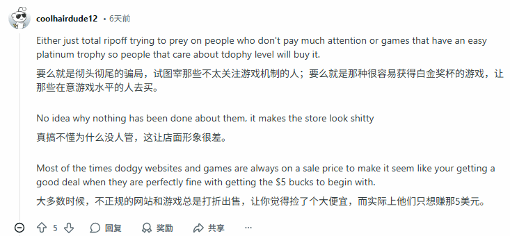 还有玩家表示,这种乱象并非PS商店独有,Steam、任天堂eShop以及Xbox等主流游戏平台都存在类似问题。更有玩家吐槽,海量低质游戏的涌入,让在商店中筛选优质作品的过程如同大海捞针,极大消耗了玩家的时间和精力。