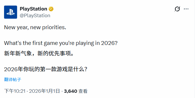 2026年新年的钟声刚过,PlayStation官方便在社交媒体上发起了一场充满仪式感的互动,用一句“新年新气象,新的优先级。你在2026年玩的第一款游戏是什么?”,瞬间点燃了玩家社群的讨论热情,成为开年之初游戏圈的热门话题。