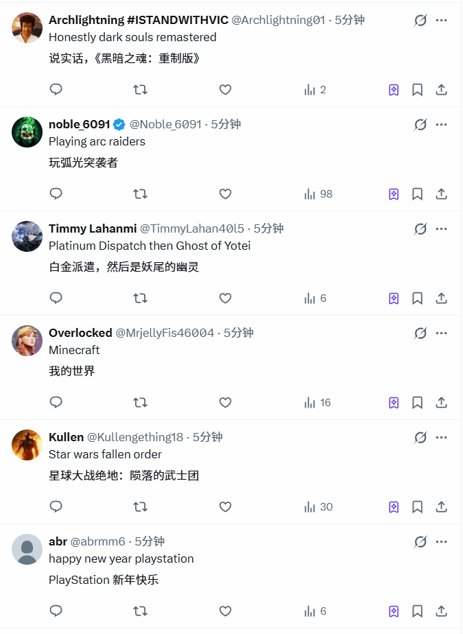 这场互动的评论区堪称玩家口味的“全景展示”,不同偏好的玩家纷纷分享自己的开年选择,画风多元又热闹。不少情怀向玩家选择以经典开启新一年,直言“开年必须是《黑暗之魂 重制版》,经典永不过时”;还有一部分玩家仍沉浸在上一年的大作余韵中,忙着给2025年的PS重磅作品《羊蹄山之魂》“补课”,细细打磨每一个游戏细节;除此之外,也不乏坚守“超级地球”的硬核玩家,即便迈入新年,依旧在《地狱潜兵2》的战场中奋战不息。