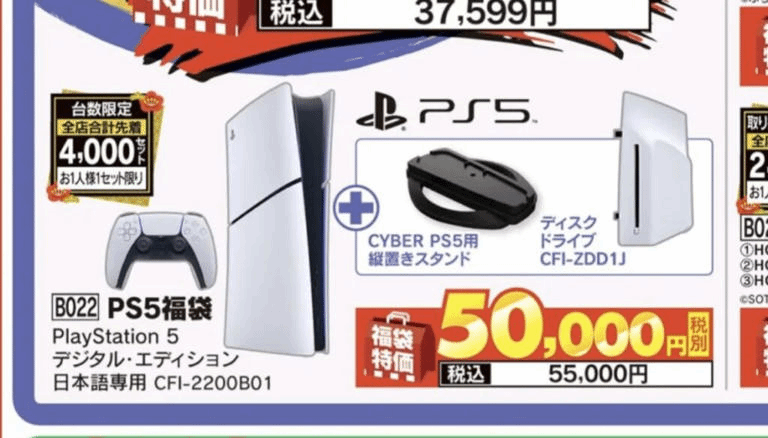 本次促销的核心主角,是2025年11月才在日本本土上市的新型PS5数字版(型号:CFI-2200B01)。这款被称为“日本专供版”的机型官方零售价为55,000日元(含税),而本次促销的关键亮点就在于“加价不加价送核心配件”。