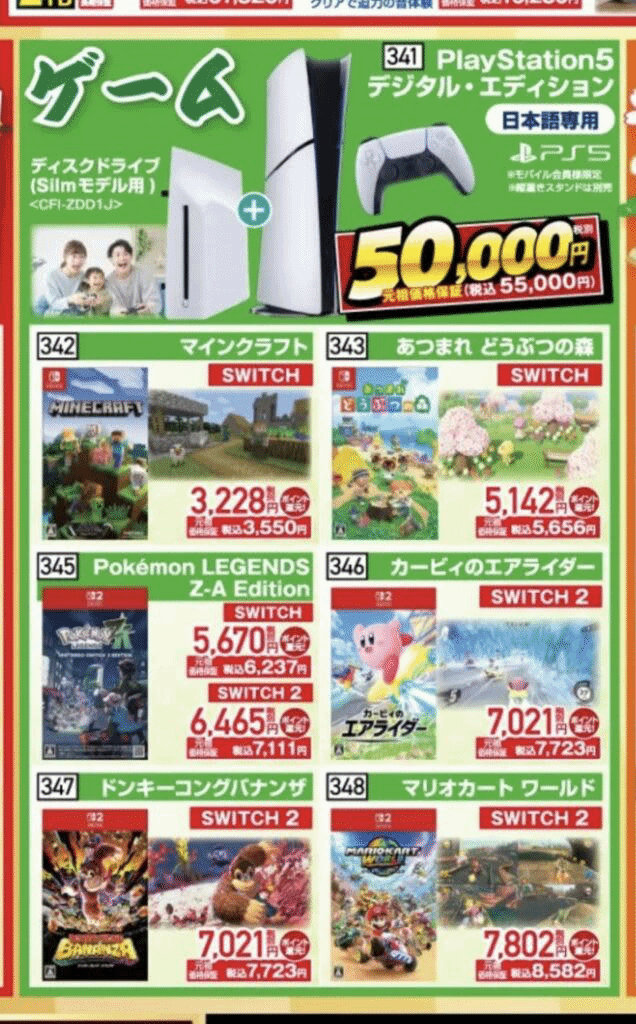 除了山田电机,其他主流零售商也纷纷跟进推出优惠:Nojima同样推出55,000日元的“数字版+光驱”套装,不过该方案主要面向品牌移动端会员;Joshin则在其线上商城推出价值65,000日元的PS5福袋,除了核心的主机+光驱套装,还直接捆绑了2025年现象级大作《怪物猎人:荒野》,一站式满足购机和玩新游的需求。