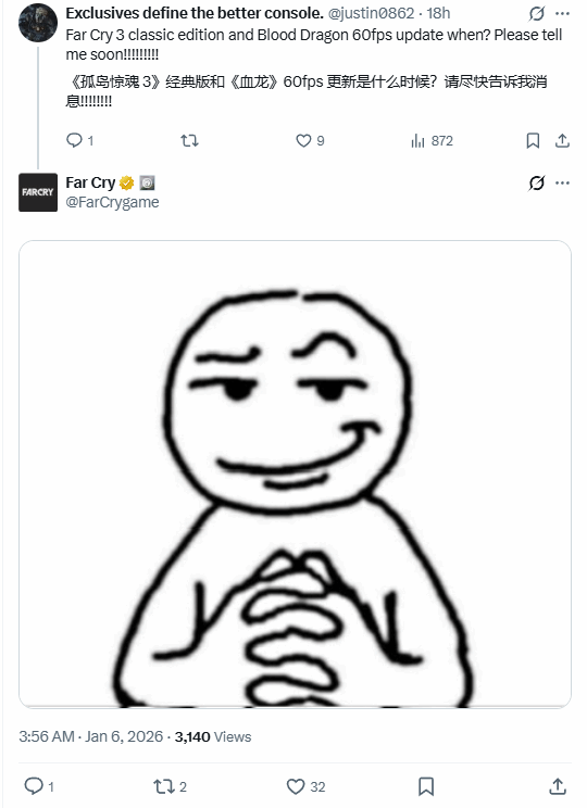 事情源于育碧的一条官方动态下方,玩家@justin0862直接留言喊话:“《孤岛惊魂3》经典版和《孤岛惊魂3:血龙》到底什么时候能推出60帧更新?麻烦尽快给出答复!!!!!!”面对玩家的急切追问,《孤岛惊魂》官方账号并未给出任何文字回应,而是第一时间回复了一个意味深长的神秘表情包。