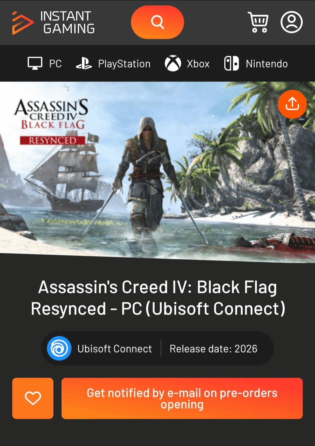 据玩家爆料,多家线上游戏零售商已悄然上线《刺客信条4:黑旗 重制版》的PC版商品页面。页面信息显示,该作将登陆Ubisoft Connect平台,发售时间标注为2026年,同时还设置了“预购开启邮件提醒”功能,引发系列粉丝广泛关注。