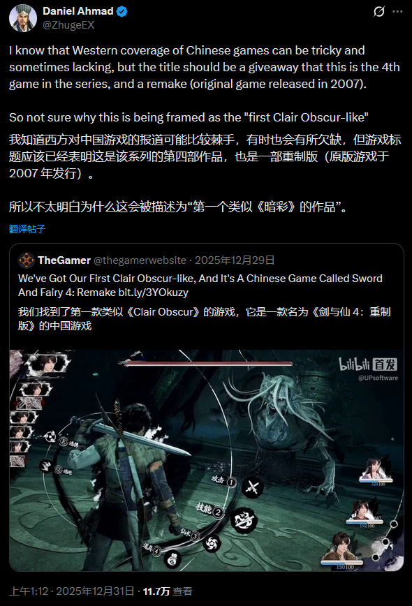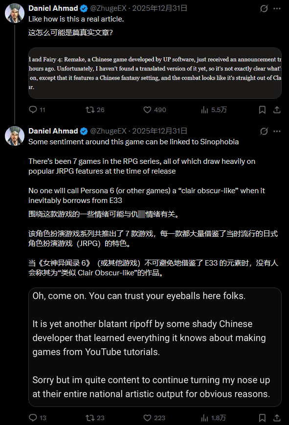 游戏行业资深分析师Daniel Ahmed此前就曾公开质疑:西方媒体对中国游戏的报道时常存在信息匮乏甚至偏见的问题。《仙剑奇侠传四》是2007年原作的重制版,怎么就成了“首个模仿33号远征队的游戏”?他还补充表示,未来的《女神异闻录6》必然也会借鉴同类玩法元素,但届时大概率不会有人站出来指责其模仿。