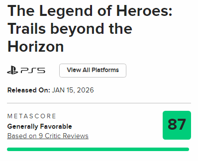 由NIS America发行的《英雄传说:界之轨迹》英文版,定于1月15日正式推出。日前,游戏评测聚合平台MetaCritic(简称M站)公布了该版本的媒体综合评分,最终定格在87分;截至信息发布时,已有9家专业媒体完成了对这款作品的评测打分。