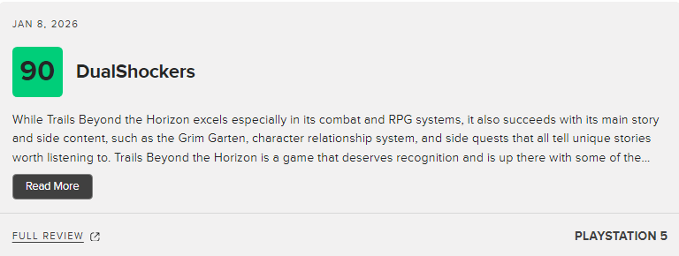 多家外媒在评测中给出了高度评价。其中,DualShockers打出90分,认为《英雄传说:界之轨迹》的战斗体系与RPG核心机制表现亮眼,主线情节与支线内容的打造同样出彩;游戏中的角色关联网络,以及每段各有千秋的支线故事,都值得玩家深入探索,足以跻身同类型题材作品的顶尖梯队,该评测基于PS5平台完成。