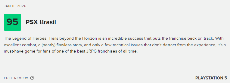 PSX Brasil给出了95分的高分评价,称《界之轨迹》是一次令人惊艳的成功,成功让系列重回巅峰轨道。评测指出,游戏具备出色的战斗系统与近乎完善的剧情架构,即便存在少量技术层面的小问题,也丝毫不影响整体品质,这份评测同样基于PS5平台。