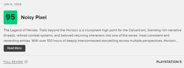 Noisy Pixel同样给出95分,评价本作将丰富的叙事脉络、精简高效的战斗系统,以及备受玩家喜爱的回归角色完美融合,打造出系列中叙事连贯性最强、最值得投入时间的作品之一。通过多视角交织推进的叙事模式,以及超过100小时的深度关联剧情,《界之轨迹》在情感感染力与系统打磨精度上均交出了出色答卷,该评测平台为PS5。