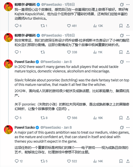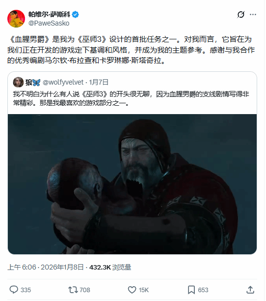 令人惊喜的是,这条推文得到了任务设计者之一Paweł Sasko的回应。他坦言,“血腥男爵”是自己为《巫师3》设计的早期任务之一,而创作这个任务的核心目的,是为整部游戏定下基调和风格,同时也成为了自己后续创作的主题参考。虽然他没有过多展开剧情设计的具体细节,但这番分享让玩家得以窥见经典背后的创作考量——正是这种对“基调定调”的严谨态度,才让“血腥男爵”任务跳出了传统支线的框架,成为推动世界观塑造、传递游戏核心气质的关键部分。