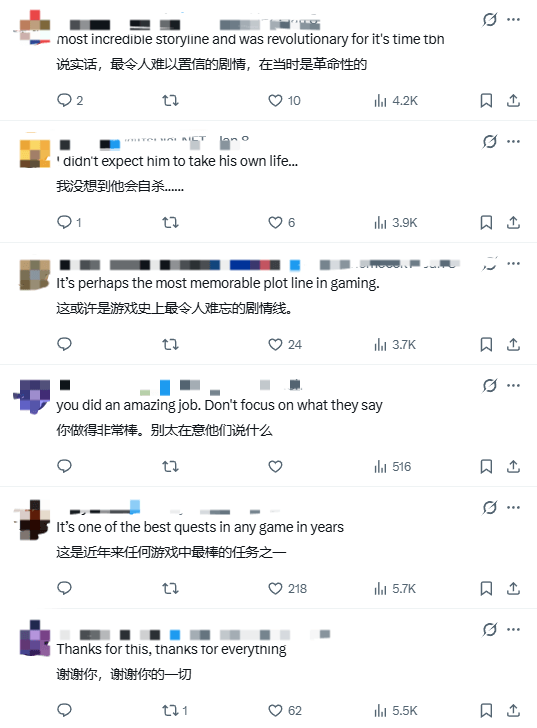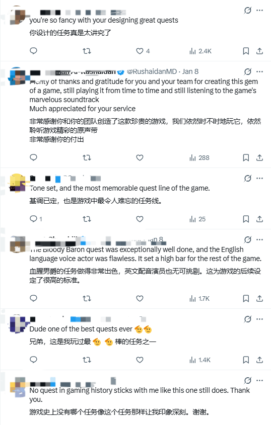 Paweł Sasko的回忆也点燃了玩家的怀旧情绪,评论区里满是对经典的致敬与感激。有玩家留言:“谢谢你打造出这样有温度的任务,这才是《巫师3》的灵魂所在”;还有玩家感慨:“当年玩到血腥男爵任务时就知道,这游戏绝对不一般”。大家纷纷分享自己初次体验该任务时的感受,有人被剧情的反转打动,有人纠结于任务中的道德选择,更有人因任务里的人物命运而共情,足以见得这个任务的生命力之持久。