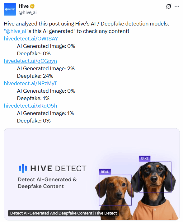 AI图像检测工具“Hive”的官方账号也通过X平台介入此事,公布了对4张争议宣传图的检测结果。数据显示,辛克莱尔出镜的那张图片被判定为深度伪造的概率为24%,属于相对较高的数值;但其余3张图片的AI生成概率仅在0%至2%之间,处于极低水平。基于这一结果,Hive方面给出“使用AI制作可能性较低”的结论,间接为任天堂提供了支撑。