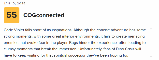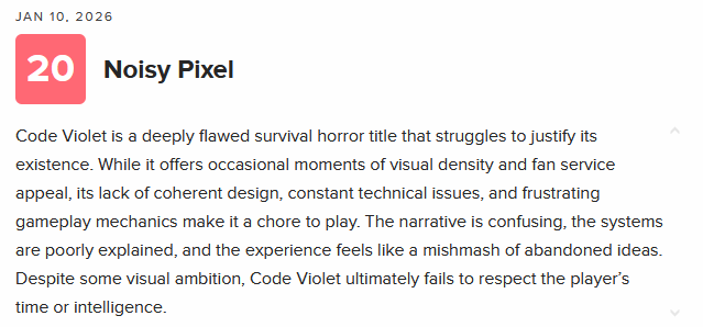 由TeamKill Media开发的PS5独占第三人称动作恐怖游戏《Code Violet》,已于1月10日正式发售。目前,该作在游戏评分聚合平台MetaCritic(简称M站)的评分数据已正式公开。