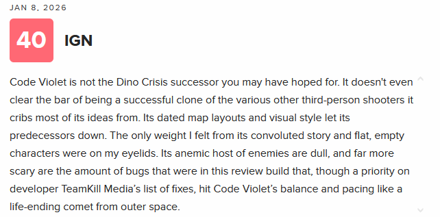 《Code Violet》绝非玩家期待中的《恐龙危机》继承者。它甚至没能达到合格第三人称射击“模仿作”的最低门槛——而游戏的多数设计思路正是从这类作品中借鉴而来。过时的地图布局与视觉风格,让其借鉴的前辈作品蒙羞。混乱的剧情走向与扁平空洞的角色塑造,唯一能带来的“厚重感”,只有让人昏昏欲睡的疲惫。