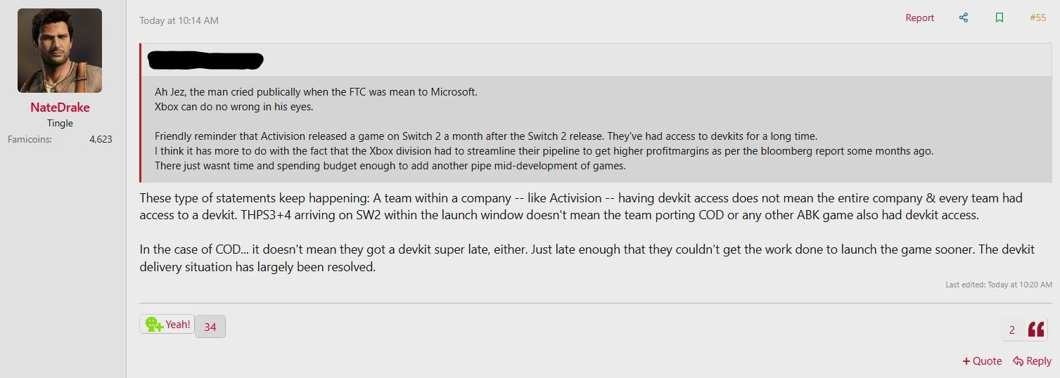 这一推测并非空穴来风,此前已有多位业内知名消息人士的爆料形成呼应。其中,Windows Central执行编辑Jez Corden曾透露,首款Switch版《使命召唤》的开发工作已接近尾声,预计将在数月内正式发布。另一位消息人士NateTheHate则在游戏论坛上进一步补充细节,证实《使命召唤》制作组已收到Switch 2开发机,还解释道:“就《使命召唤》而言,这并不意味着他们拿到开发机的时间非常晚,而只是晚到无法及时完成相关工作、从而更早推出游戏而已。开发机交付方面的问题基本已经得到解决。”