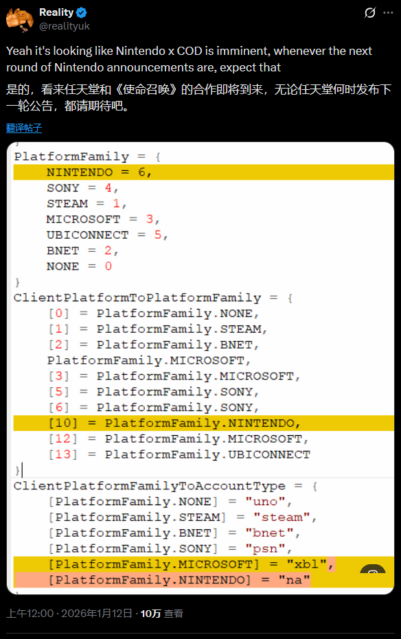 最引人注目的新线索来自《使命召唤》资讯博主@realityuk的发现。他在游戏整合客户端CODHQ的后台代码中,捕捉到了一串与任天堂相关的字符。基于这一发现,该博主推测,任天堂与《使命召唤》制作方的合作已箭在弦上,后续任天堂发布新消息时,大概率会正式公布相关合作细节。