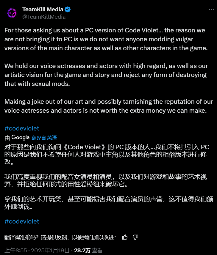 值得关注的是,这家知名度不高的开发团队此前曾多次明确表态,《Code Violet》将仅登陆PS5平台,不会涉足Steam等其他游戏平台。对于这一独占决策,官方给出的解释是,为避免游戏内主角及其他角色遭到“低俗篡改”,希望守护作品的创作初衷。