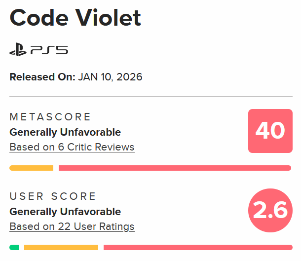 此前备受关注的PS独占第三人称动作恐怖游戏《Code Violet》,自1月10日发售以来口碑持续走低。该作在评分网站M站的媒体评分仅为40分(百分制),玩家评分更是低至2.6分(10分制)。