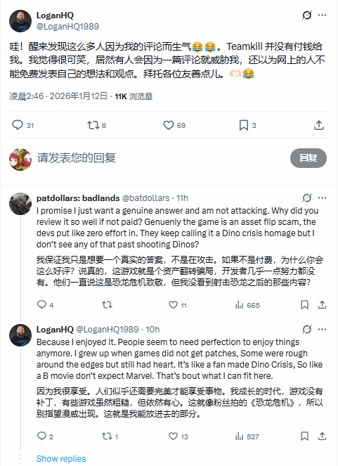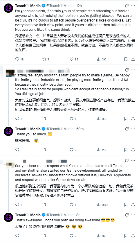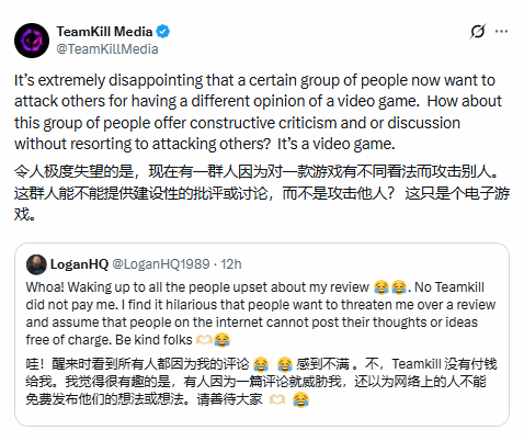 1月12日,游戏开发团队@TeamKillMedia通过官方推特发文,引用了@LoganHQ1989的相关情况,并对当前的混乱局面作出回应:“令人深感失望的是,如今有部分人会因为对一款游戏的看法不同就攻击他人。这些人能否提出有建设性的批评或展开理性讨论,而非诉诸人身攻击?这终究只是一款电子游戏而已。”