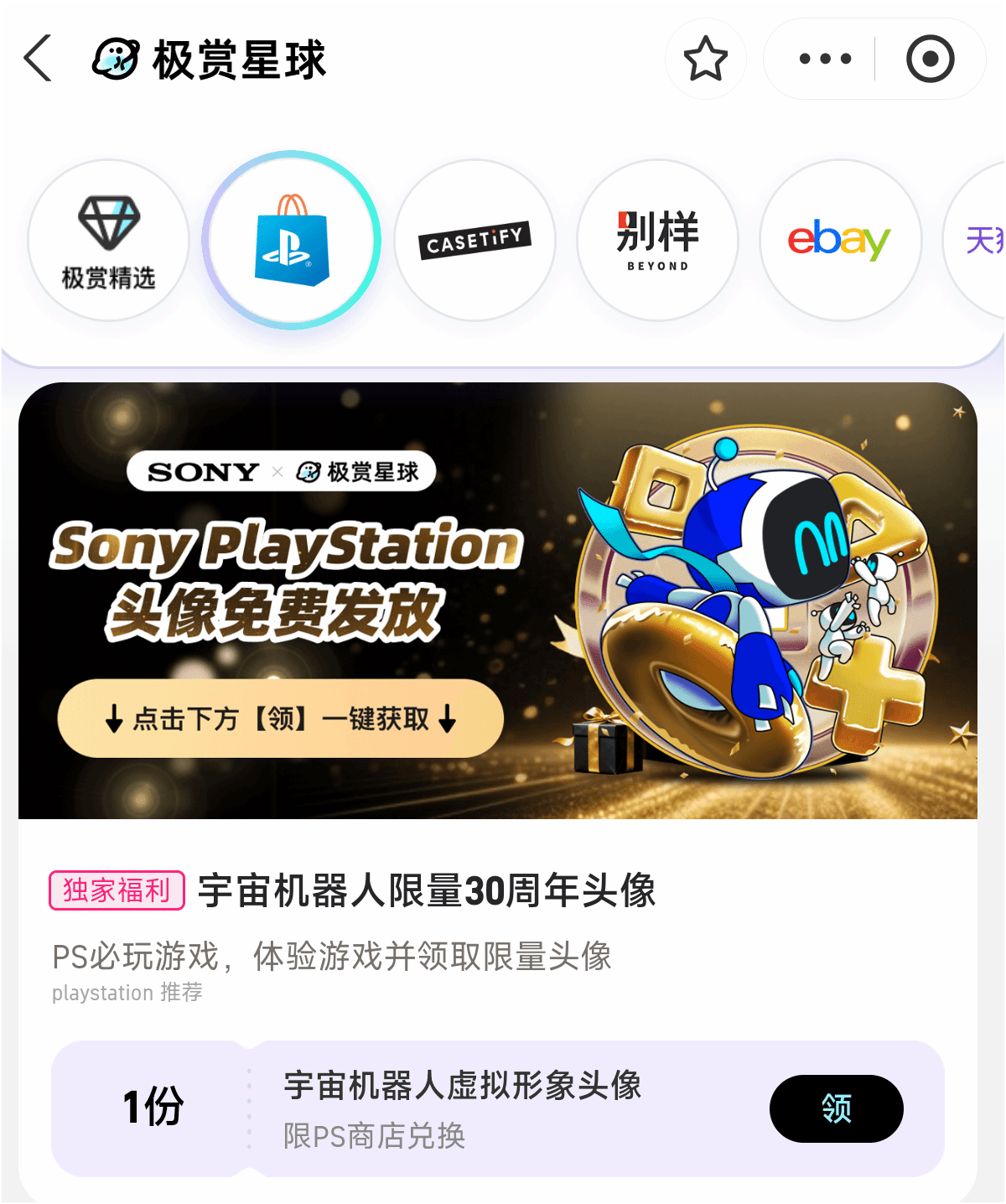 PS5独占大作《宇宙机器人》的30周年限量款头像现已开放免费领取,喜欢这款游戏的玩家可通过支付宝便捷获取。