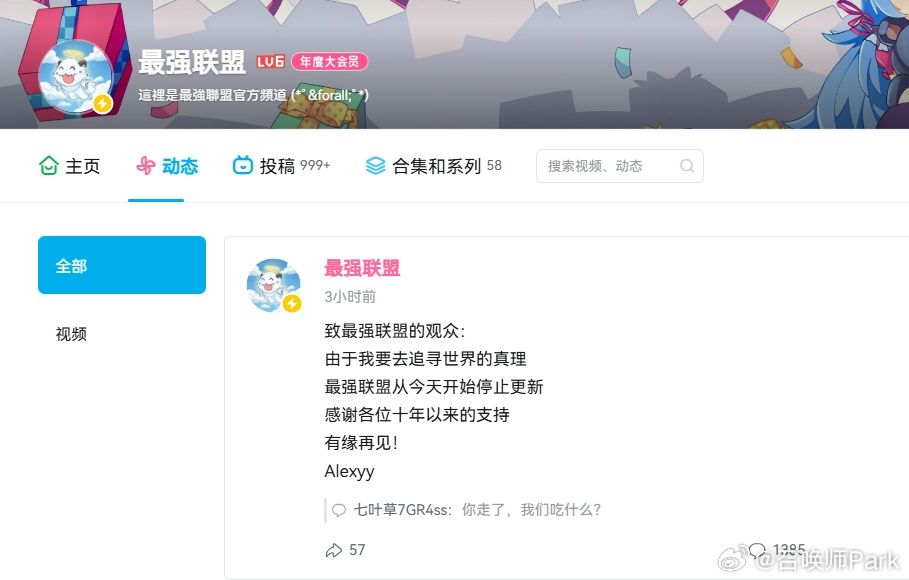 “最强联盟”的停更宣言充满诗意:“致最强联盟的观众,由于我要去追寻世界的真理,最强联盟从今天开始停止更新,感谢各位十年以来的支持,有缘再见!Alexyy留。”短短数语,既有告别之意,也透露着对新生活的向往,落款“Alexyy”正是该博主的标识。