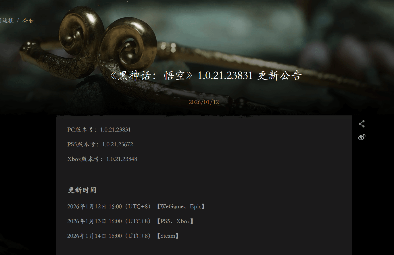 各平台的更新推送时间已明确划分:WeGame与Epic平台于2026年1月12日16:00(UTC+8)率先开启更新;PS5和Xbox平台的更新则在2026年1月13日16:00(UTC+8)上线;Steam平台玩家需稍作等待,更新将于2026年1月14日16:00(UTC+8)正式推送。